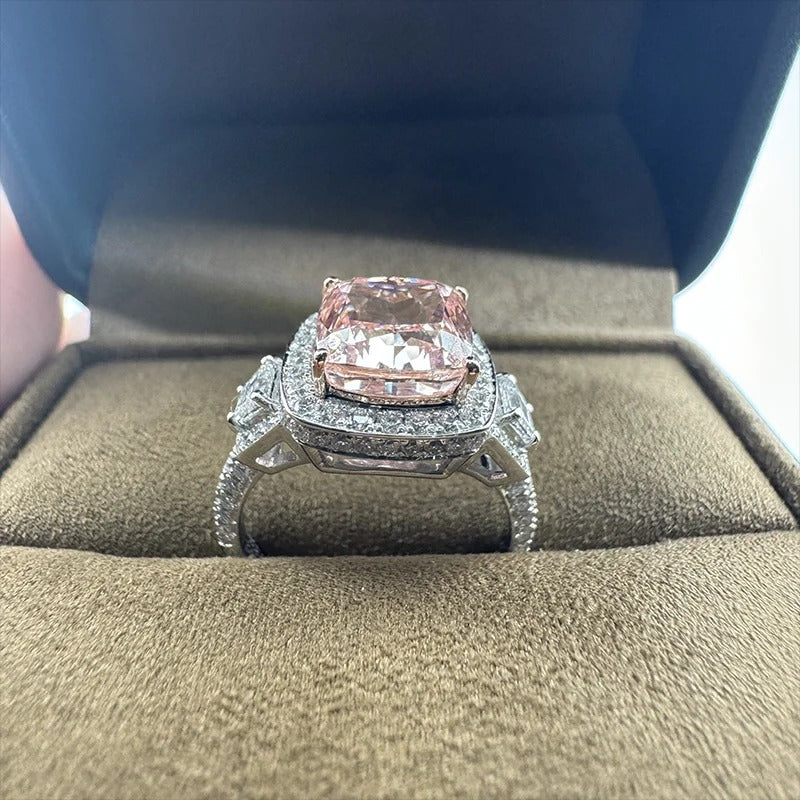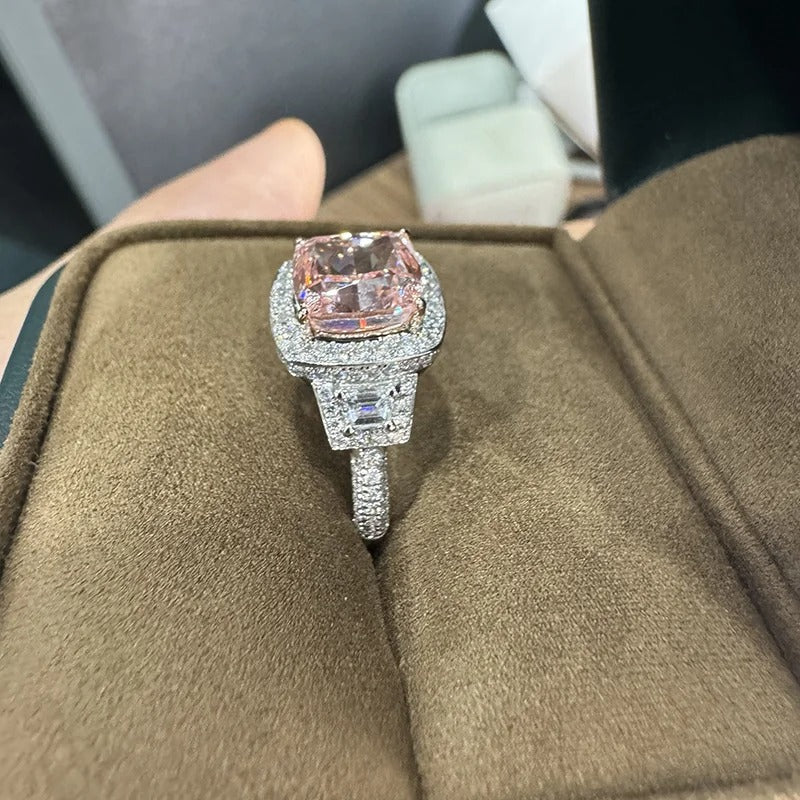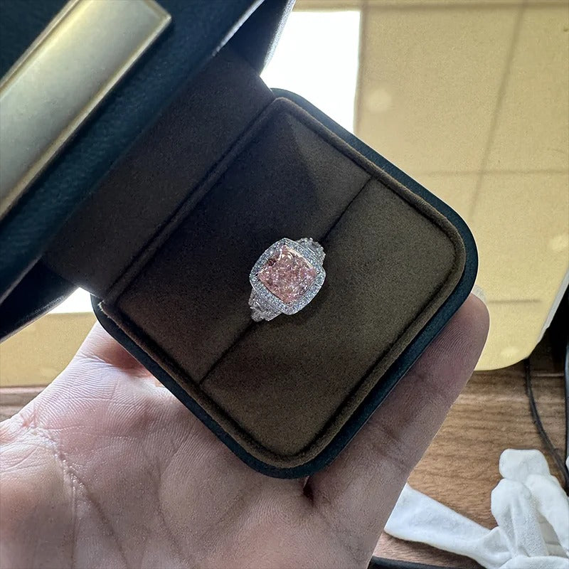 Joia confeccionada em Ouro Branco 14K, com diamante Rosa cultivado em laboratório de 3,0 ctw, lapidação Cushion, produzido pelas tecnologias CVD + HPHT. A pedra central se destaca pela tonalidade Rosa Chique, brilho intenso e presença sofisticada.