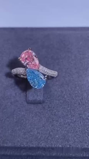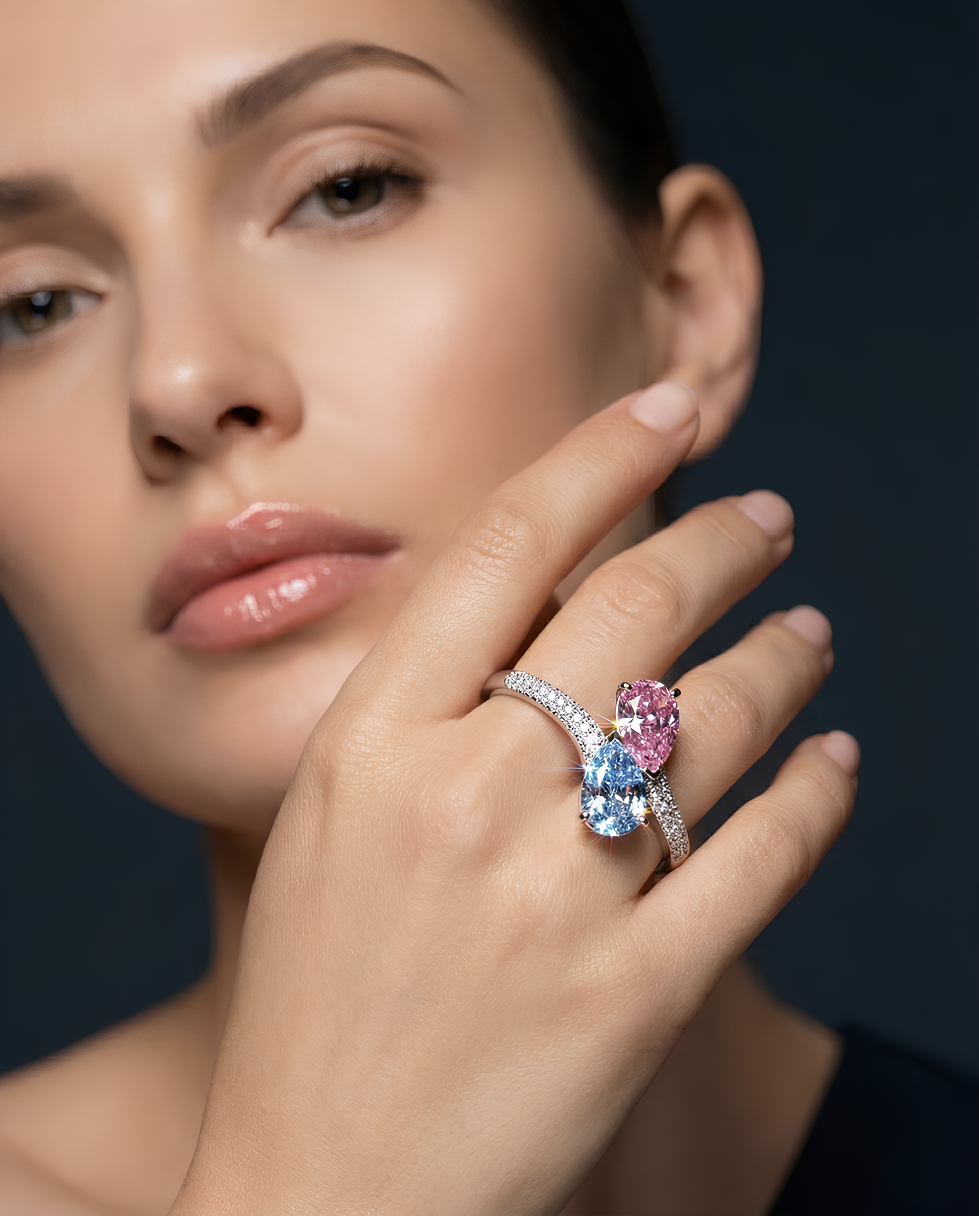 O grande destaque do Anel Kim está em sua combinação rara de cores: Fancy Pink e Fancy Blue, tonalidades sofisticadas e altamente desejadas no universo da joalheria. Juntas, as gemas totalizam 2 CTW (quilates totalweight) , criando um contraste harmonioso e exclusivo, que eleva a peça a um verdadeiro objeto de desejo.